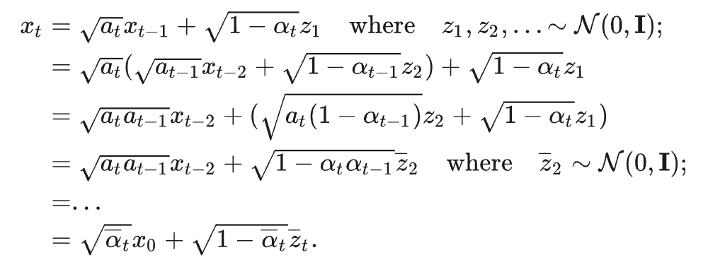 It turns out that \(q(x_{t+1} \vert x_0)\) and \(q(x_t \vert x_0)\) can be solved using reparameterization trick. The mathematical derivation of the trick is below.