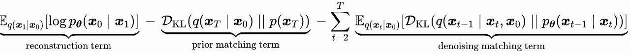 In order to train a model, we must define its loss function. By maximizing the likelihood of data distribution \(log p_{\theta}\) and a series of math deduction, we can get the loss function. The full derivation of loss terms is referenced here