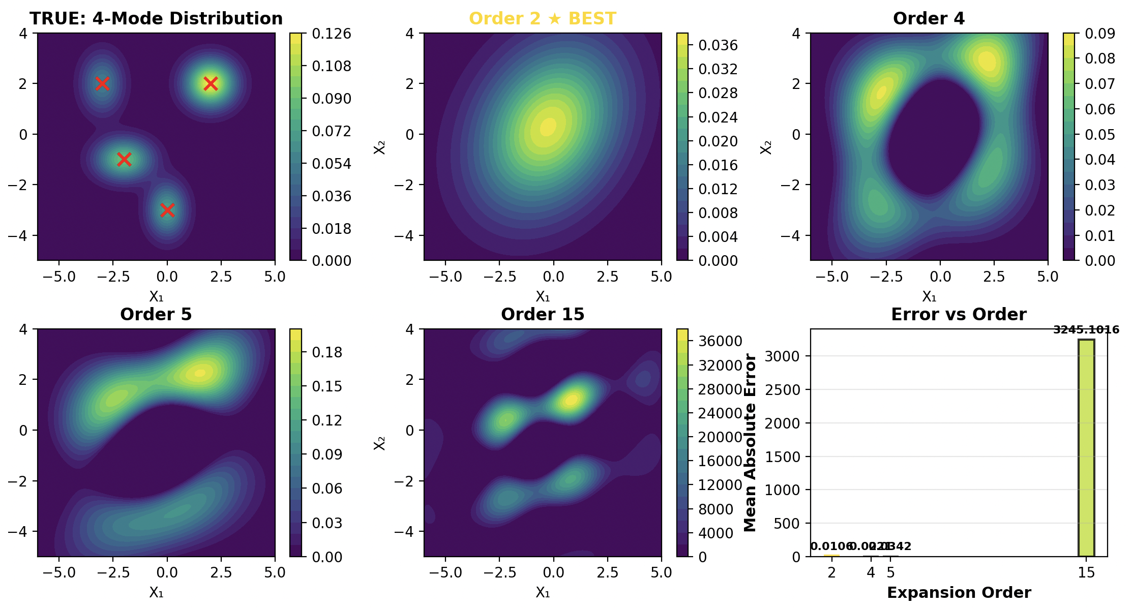 As the figure shows, although the expansion does produce 4 modes, it struggles to capture the four distinct peaks, which indicate that it’s poor at approximate distributions with distinctive modes.
